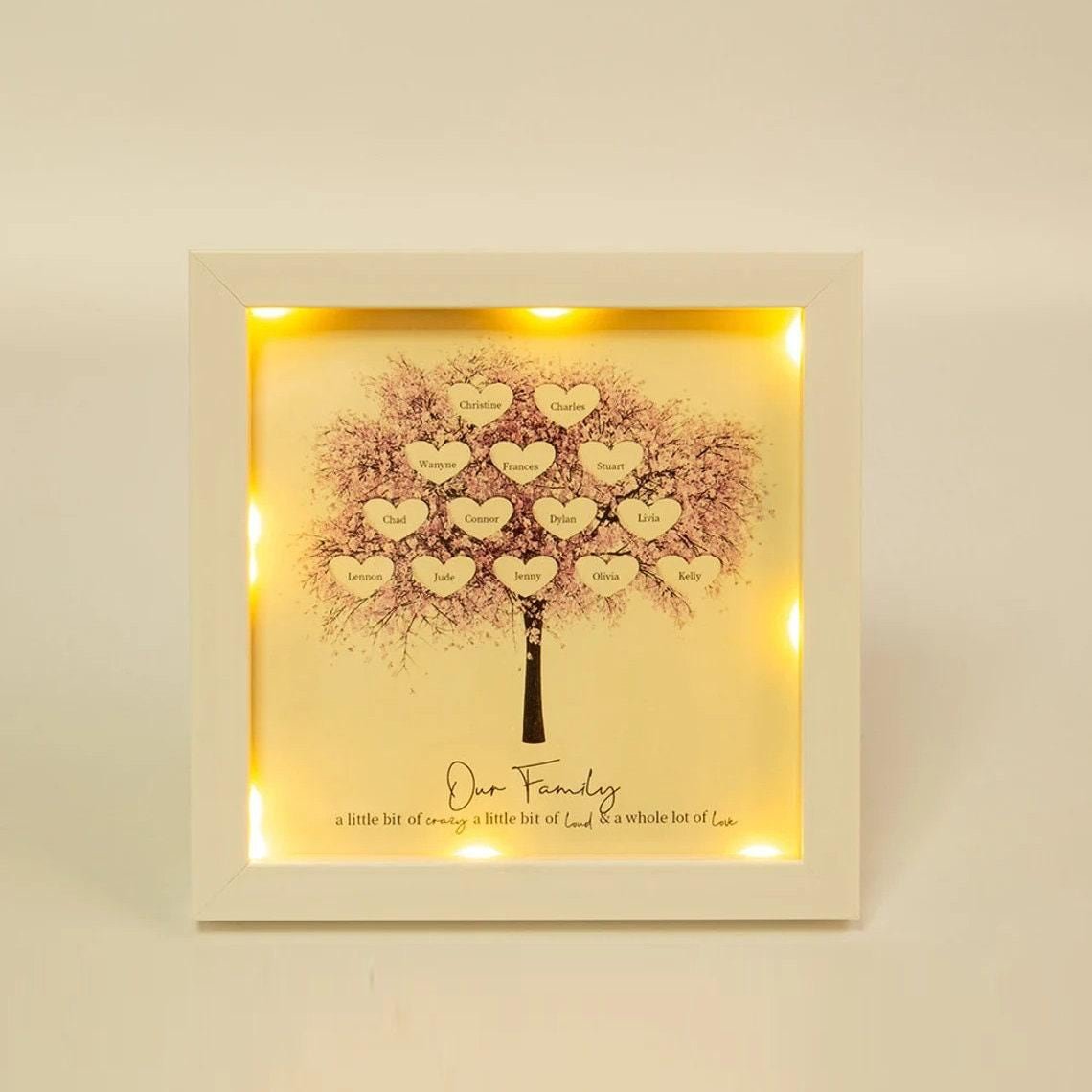 The warm LED lighting casts a glow that makes the family tree design stand out, creating a cozy ambiance in any space. Each shadow box is crafted with care and designed to last, making it an heirloom-worthy keepsake.