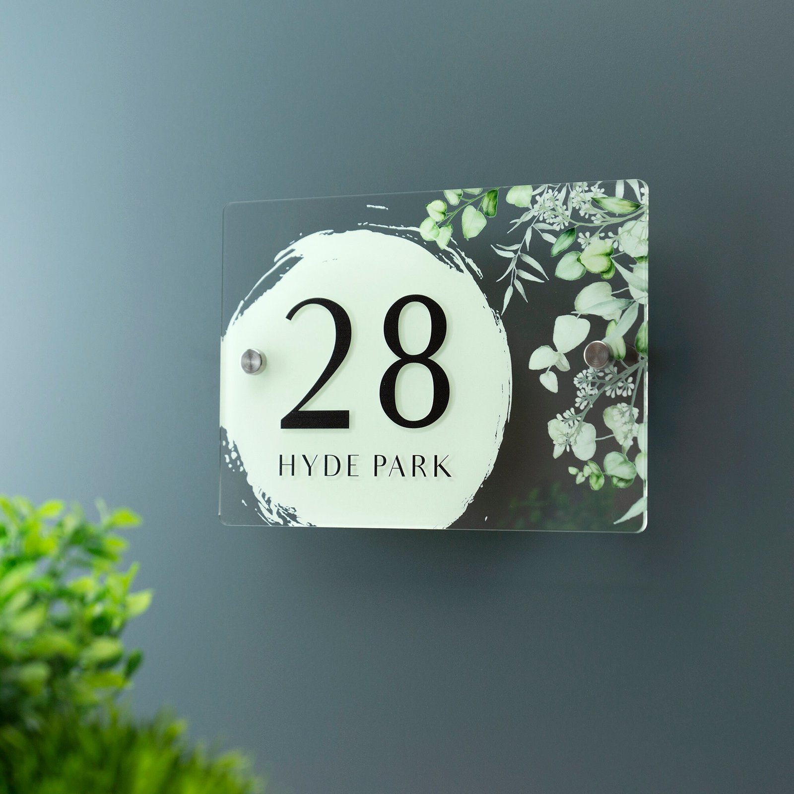Inspired by botanical beauty and vintage elegance, this printed plaque combines soft watercolor eucalyptus leaves with clean, modern typography—offering a perfect balance of charm and clarity for every style of property.
