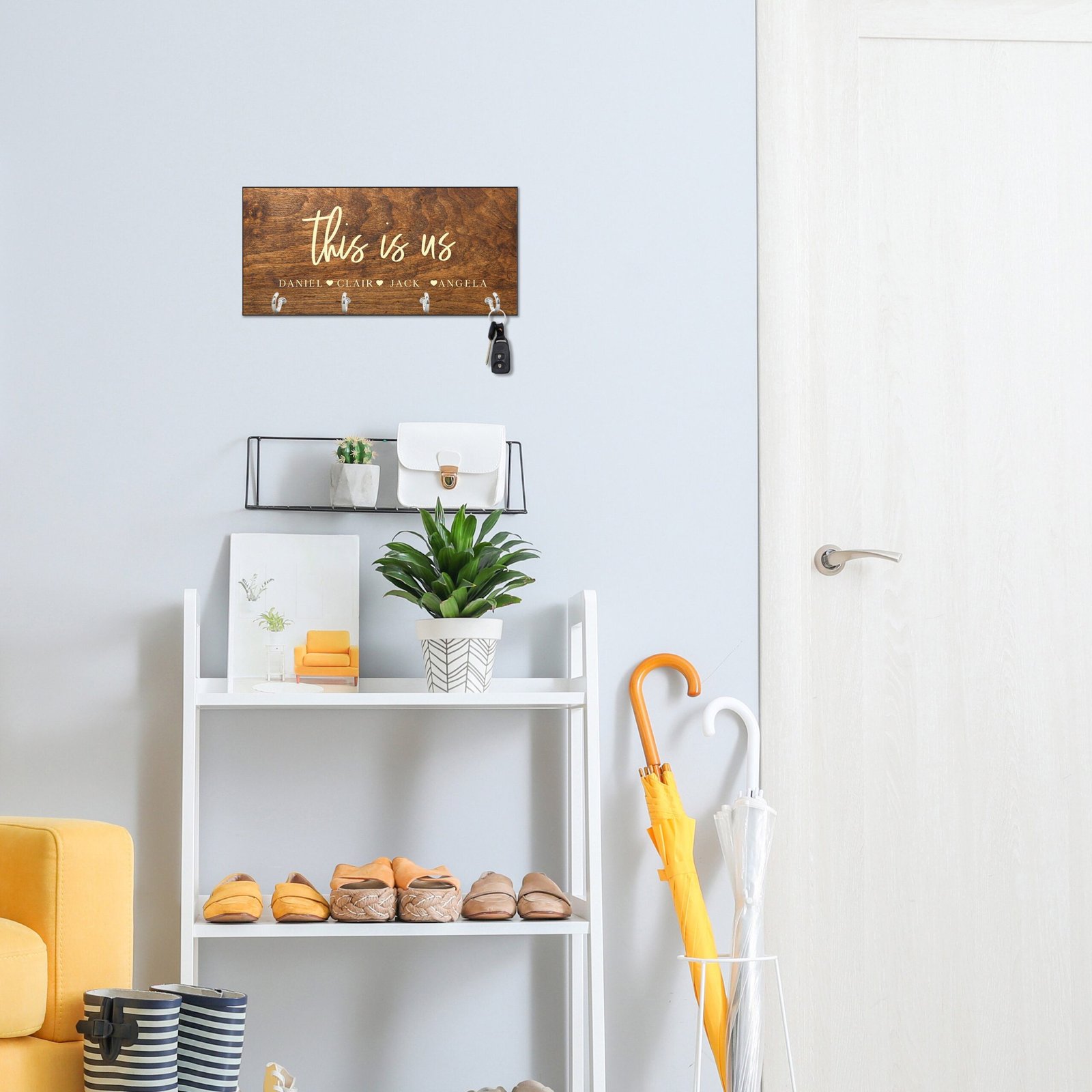 Whether you’re gifting it to a newlywed couple, new homeowners, or buying it for your own family, this charming piece is a functional yet decorative addition to any entryway or office wall.